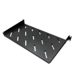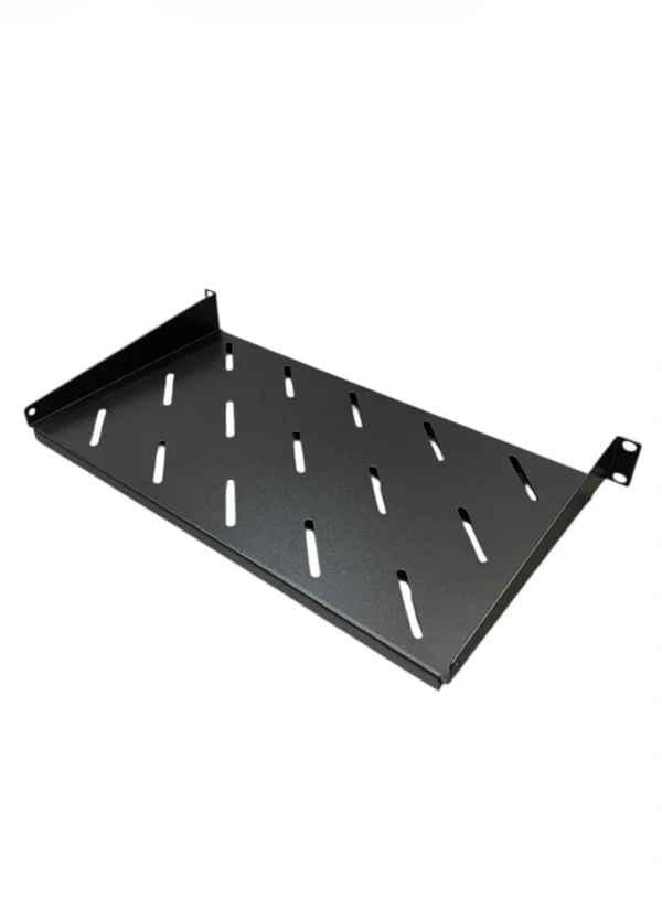 Bandeja fija ALKO 1U de 25 cm de profundidad para rack 19″ con perforaciones de ventilación y múltiples orificios de fijación; diseñada para soportar equipos compactos (ONT, conversores, PoE injectors) distribuyendo carga con tuercas jaula y tornillería M6.