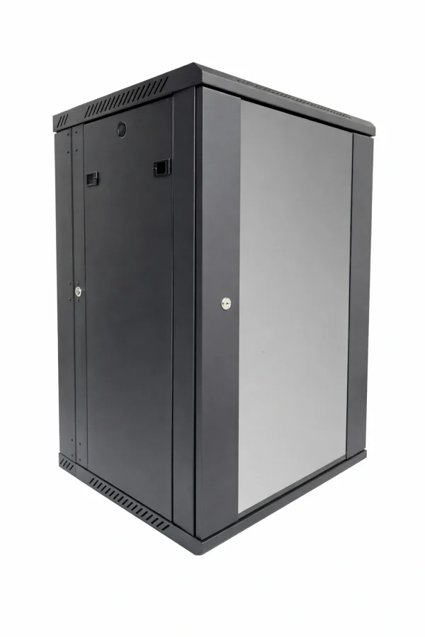 Gabinete mural 19″ ALKO 18RU pivoteable (90×60×55 cm) con puerta de vidrio templado, paneles laterales desmontables y entradas de cable; marco posterior abatible para mantenimiento cómodo del patching y equipos.