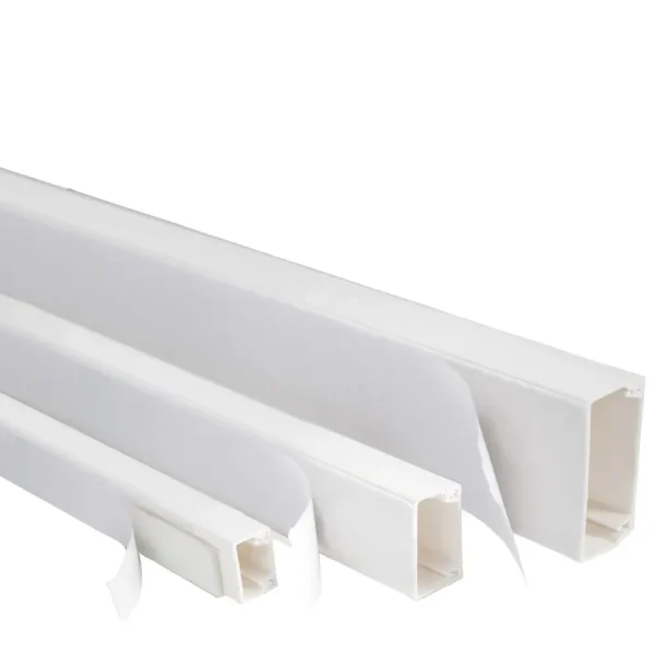 Canaleta SATRA 24×14 mm con adhesivo de 2 m en PVC blanco, tapa a presión y cierre firme; apta para pequeñas derivaciones de cableado de red/telefonía y baja tensión con rápida instalación; compatible con accesorios de unión, ángulos y derivaciones.