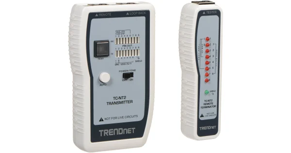 Probador TrendNet para cableado RJ45 y coaxial que verifica continuidad y mapa de pines/fallos típicos (abiertos, cortos, inversión, pares cruzados), con unidad remota para pruebas extremo a extremo.